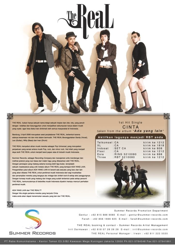 Setelah My Name Is Keisha muncul di blog kami, kini kami juga mendapatkan lagi permintaan untuk memposting blog kami dengan artist major dari Summer Records, yang bernama The Real, dengan 4 personilsnya, yaitu Sandy (Vocal), Leo (Guitar, Backing Vocal), Willy (Bass) dan Ivan (Drum). Walaupun nama The Real masih asing di telinga masyarakat, namun satu band ini sepertinya sedang berjalan menuju puncak ketenarannya setelah mereka live concert di Derings Trans TV dan Kiss Vaganza Indosiar. Belum lagi munculnya video clip terbaru mereka yang dengan hits single Cinta. Namun seperti apa lagu dari The Real band? Sebelum kita mendengar dan mendownload lagu dari The Real, gak ada salahnya deh kami bawa kalian buat nonton sedikit video dari The Real.