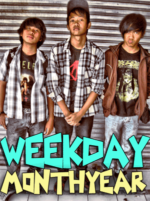 Sempat heran saat pertama kali kami membaca kata dari Weekday Monthyear, kami sempat menyangka bahwa kata dari Weekday Monthyear adalah sebuah judul lagu! Tapi ternyata Weekday Monthyear adalah nama sebuah band yang mempunyai 3 personils, yaitu Iiq Mubariq Hafiz (Vocal, String, Guitar), Yanuar Nurzaman (Vocal, Bass) dan Vega Arya Yudistira (Drum, Vocal). Weekday Monthyear mempunyai genre khas New-Pop/Pop Punk.